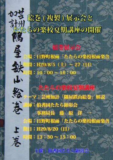 2017年07月24日 たたらの楽校(根雨)夏休み講座 絵巻物の展示について 1つ下の”たたらの楽校(根雨)夏休み講座”のお知らせで絵巻物の展示が8月5日(土)~27(日)となっておりますが、たたらの楽校(根雨)の開校日(土・日祝)のみです。(10:00~16:00) ※開校予定日でも臨時休校になる場合があります。