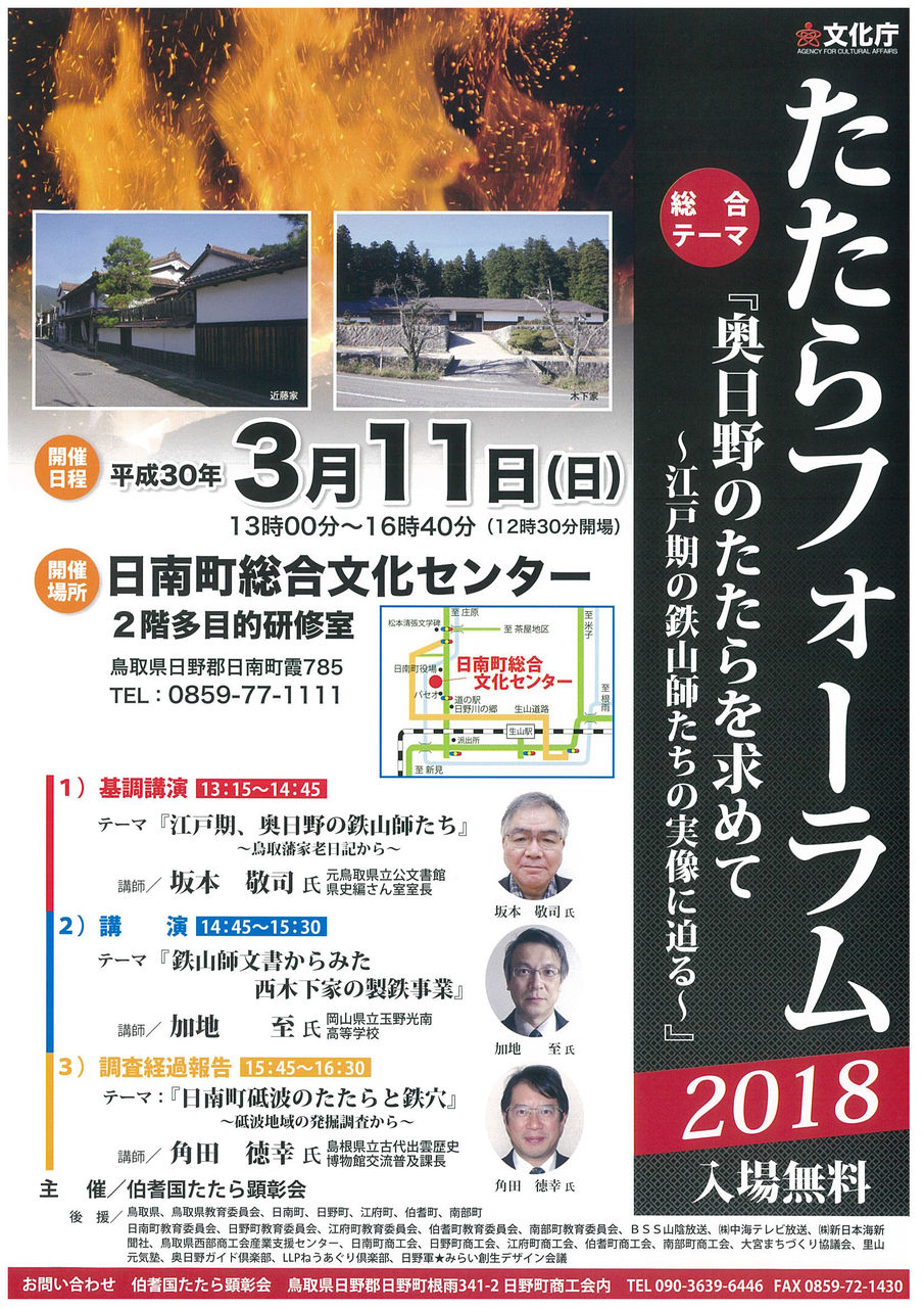 2018年02月21日 たたらフォーラム 2018開催 たたらフォーラム 2018が開催されます。多数のご来場をお待ちしております。中海テレビ そぞろ歩き 日野町根雨編でも出ておりましたがたたらの楽校(根雨)は4月初旬頃まで冬季休校中です。見学希望の方はホームページTOP>右欄のたたら楽校>たたらの楽校 設立>根雨楽舎の連絡先にてご予約ください。(なお、商工会内には専任者はいないため 折り返しの連絡になります。)